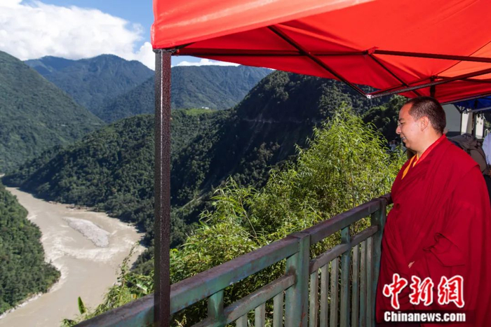 8月31日,十一世班禅在墨脱县雅鲁藏布江果果塘大拐弯调研旅游项目。中新社记者 何蓬磊 摄