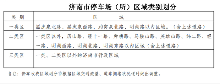 济南市实行政府定价、政府指导价的机动车停车场(所)实行区域类别差别化收费。公共停车场的区域类别,由市公安部门会同市发改、交通确定并适时调整。济南市市区机动车停放区域划分为三个区域。