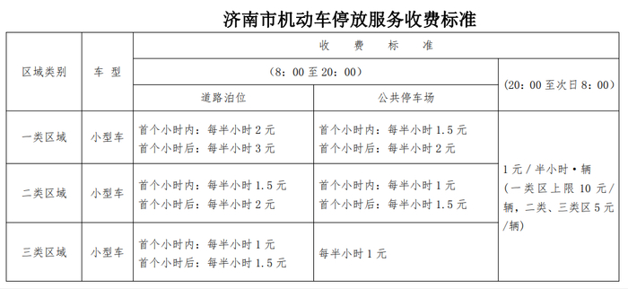对于小型车来说,一类区域8:00至20:00,道路停车首个小时内每半小时2元,首个小时后每半小时3元,公共停车场首个小时内每半小时1.5元、首个小时后每半小时2元;二类区域8:00至20:00,道路停车首个小时内每半小时1.5元,首个小时后每半小时2元,公共停车场首个小时内每半小时1元、首个小时后每半小时1.5元;三类区域8:00至20:00,道路停车首个小时内每半小时1元,首个小时后每半小时1.5元,公共停车场每半小时1元。