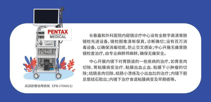 长春嘉和外科医院消化内镜科引进世界著名光学品牌Pentax医疗影像处理器EPK-i7000(A)设备用于无痛胃肠镜检查,该设备同时拥有普通图像和i-scan OE图像功能,不仅可以实现图片的表面增强、对比增强、色调增强,还可以达到光学增强的效果,360°无死角内视镜更精准清晰,诊断确切;设有百万消毒设备,以确保消毒彻底,防止交叉感染。