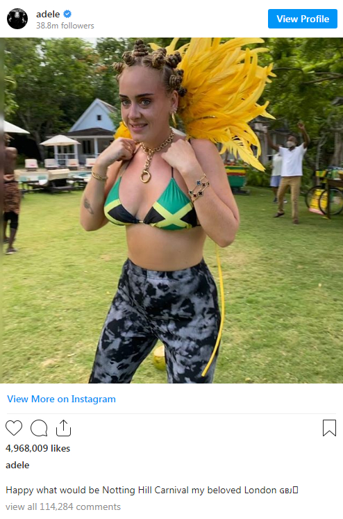 8月31日,32岁的英国流行歌手阿黛尔在Instagram账号上分享了一张庆祝诺丁山狂欢节的照片。在照片中,阿黛尔身穿牙买加国旗造型的泳装,梳着一种非洲传统发型——班图结发型。
