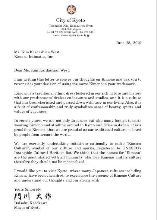 京都市长门川大作(Daisaku Kadokawa)针对此事在京都市官方网站上写了一封公开信称“Kimono象征着日式美学、日本精神和日本价值观,不应该被单一商业品牌所垄断。”