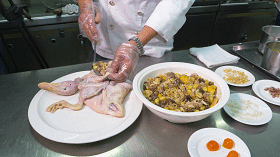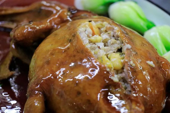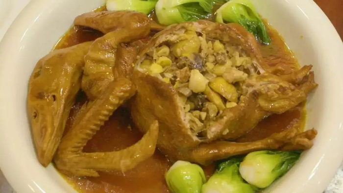 将绿豆、栗子、百合、莲子、火腿等10多种新鲜农家材料爆炒,后填充进鸭肚里。