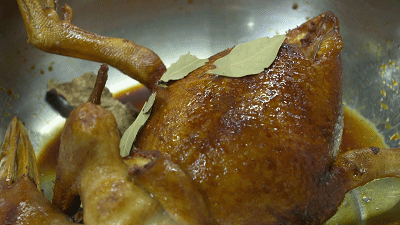 将鸭放至蒸笼,添加桂皮、八角等香料,加水后放入蒸柜,蒸1.5小时,霸王鸭就可以上桌了。