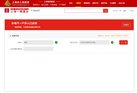 申请通过户籍或房屋信息核验后,进行电、水、气户号核验。用户用电申请需输入用电户号,用水和用气申请需选择供水、供气企业名称并输入户号,点击“下一步”按钮进行核验,核验不通过系统将予以提示。