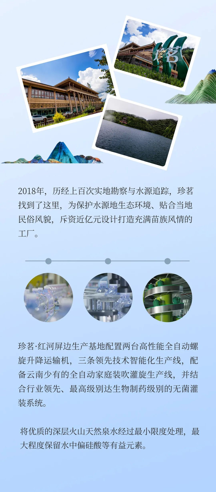 珍茗利用屏边优质资源,历时28个月、斥资近亿元建成屏边火山泉生产基地,并推出了代表“云水”的高端品牌——珍茗火山山泉。据了解,公司为基地配置了两台高性能全自动螺旋升降运输机、三条领先技术智能化生产线,以及云南少有的全自动家庭装吹灌旋生产线,结合行业领先、最高级别达生物制药级别的无菌灌装系统,将最优质的深层火山天然泉水经过最小限度处理,最大程度保留水中偏硅酸等有益元素。