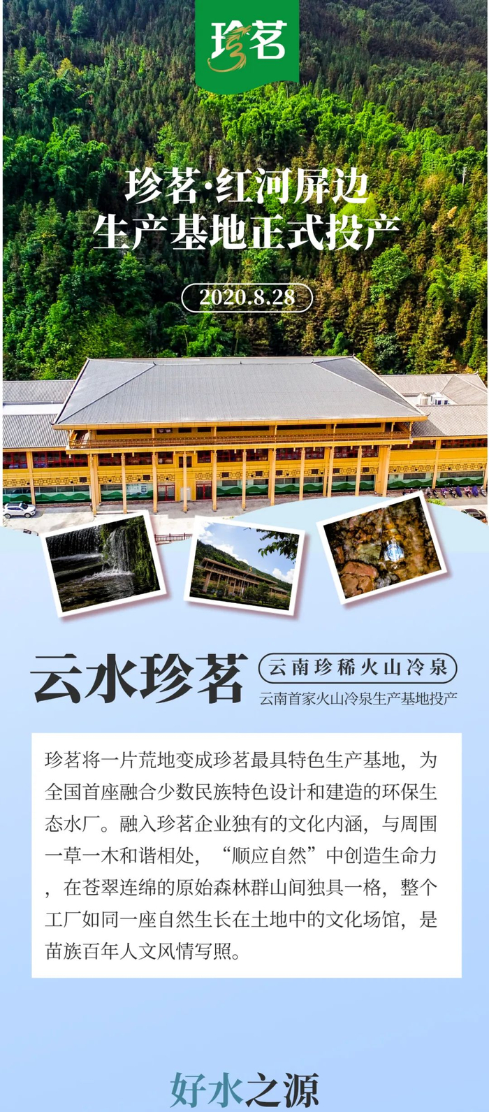 8月28日,云南首家火山泉在国家级贫困县红河屏边正式投产,这也是云南包装水龙头企业昆明珍茗食品有限责任公司的第五个生产基地。投产仪式上,该公司发布了珍茗云水战略发展纲要,并推出了珍茗云水纪念版火山山泉。