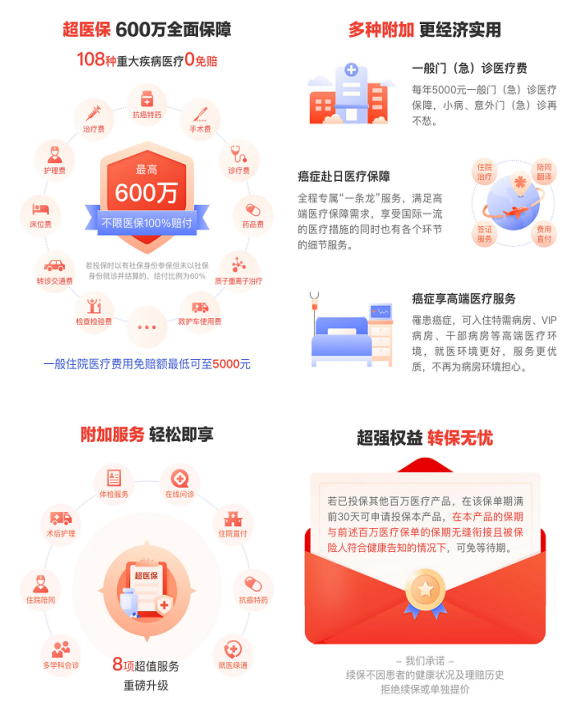 首先,“超医保”可以说是性价比颇高,最低每天花费不到1元钱,即可享受600万保额的医疗保障,涵盖108种重大疾病医疗费用0免赔额,以及恶性肿瘤特定药品费用。