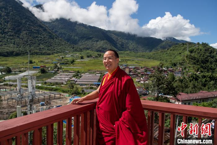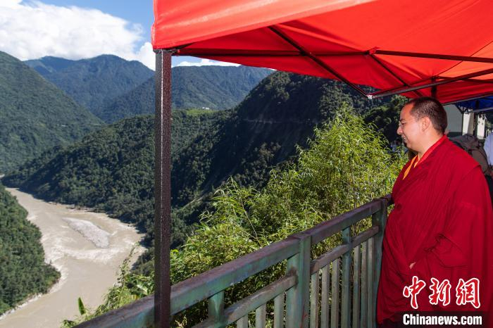 8月31日,十一世班禅在墨脱县雅鲁藏布江果果塘大拐弯调研旅游项目。中新社记者 何蓬磊 摄