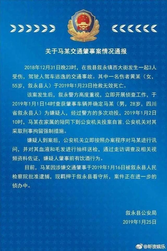 该案发生后,叙永警方高度重视,立即开展侦查工作,于2019年1月1日14时查获肇事车辆并确定马某(男,28岁,四川省叙永县人)为嫌疑人,经过警方的多次劝投,2019年1月2日10时,马某在家属的陪同下到公安机关投案自首,公安机关对其采取刑事拘留强制措施。