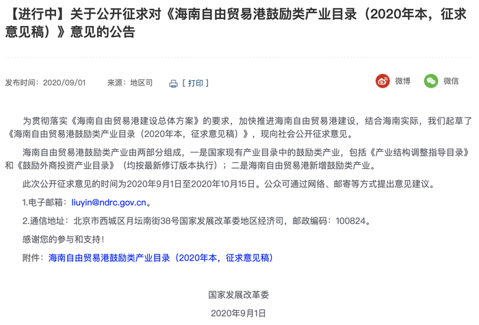 9月1日,国家发改委网站公布的《征求意见稿》显示,为贯彻落实《海南自由贸易港建设总体方案》的要求,加快推进海南自由贸易港建设,结合海南实际,制定本目录。目录共包括两部分:一是国家现有产业目录中的鼓励类产业;二是海南自由贸易港新增鼓励类产业。