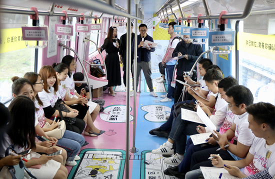 近百名单身男女在地铁里参加主题为“因为爱情”的相亲快闪。