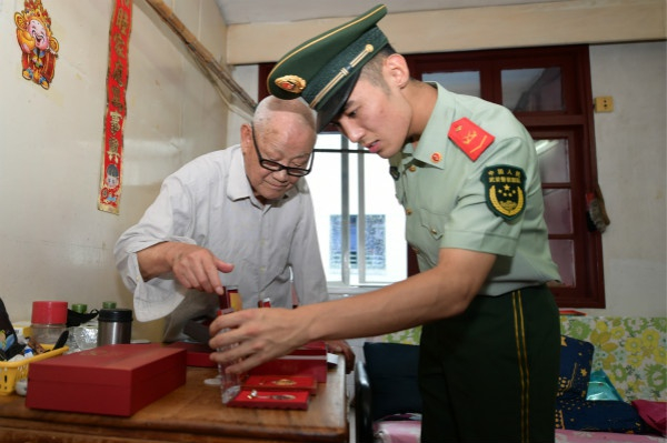 5年前,中队官兵了解到老人独自一人居住,生活多有不便,就主动负责起时爷爷的一日三餐。时业学则会经常来到军营,给官兵讲述战斗故事,俨然成了中队的“编外指导员”。
