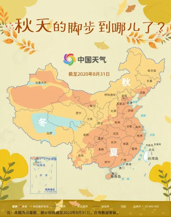 从这张图可以看出,截至8月31日,云南大部分地区已经进入秋天,但普洱、文山、西双版纳、保山大部分地区和昆明、楚雄的部分地区还依然停留在夏天的版图里。