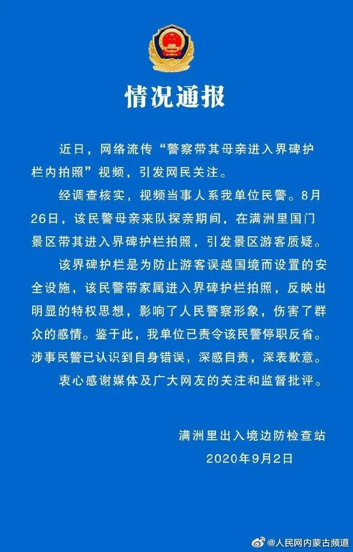 9月2日,满洲里出入境边防检查站发布“关于网传民警带家属进入界碑护栏拍照事件的情况通报”,通报称,视频当事人确系出入境边防检查站民警。8月29日,该民警带其母亲进入界碑护栏拍照,引发景区游客质疑。