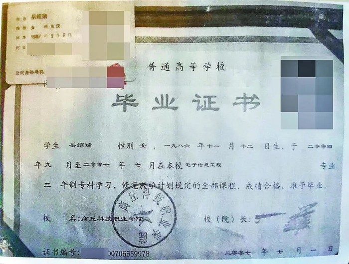 过去4年里,河南新密人岳绍瑞一直希望找回自己的学历。她在2016年偶然发现,自己2008年取得的商丘科技职业学院专科毕业证书,关联的竟是别人的身份信息。
