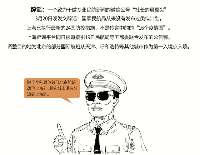 辟谣:一个致力于做专业民航新闻的微信公号“社长的晨翼尖”3月20日晚发文辟谣:国家民航局从来没有发布过类似计划,上海已执行最新的24国防控措施,不是传言中的的“16个疫情国”。他还查询了飞常准的航班,确认过初步调整的是7个航班分流,除了个别原伦敦飞北京航班改飞上海外,其它城市没有分流到上海的。上海辟谣平台同日报道援引19日民航局等五部委联合发布的公告称,调整目的地为北京的部分国际航班从天津、呼和浩特等其他城市作为第一入境点入境。
