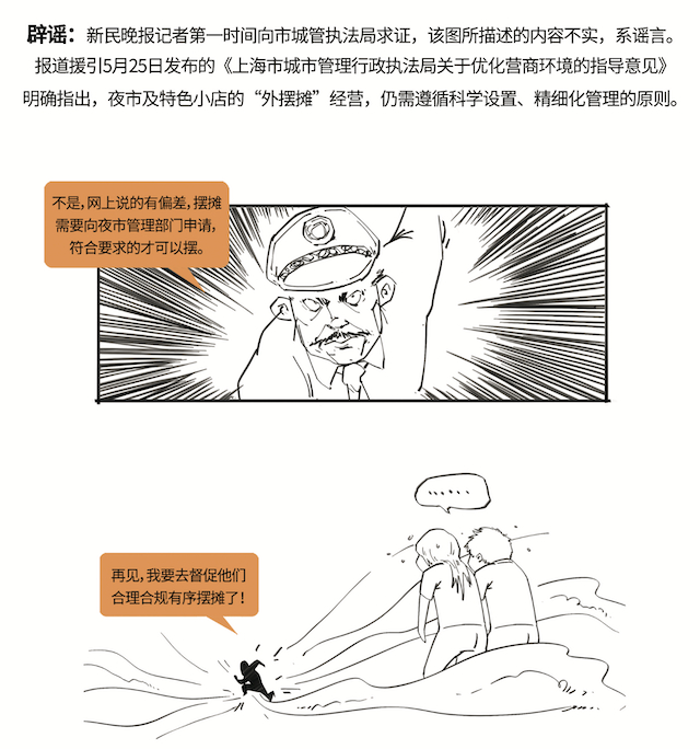 辟谣:新民晚报记者第一时间向市城管执法局求证,该图所描述的内容不实,系谣言。报道援引5月25日发布的《上海市城市管理行政执法局关于优化营商环境的指导意见》明确指出,夜市及特色小店的“外摆摊”经营,仍需遵循科学设置、精细化管理的原则。
