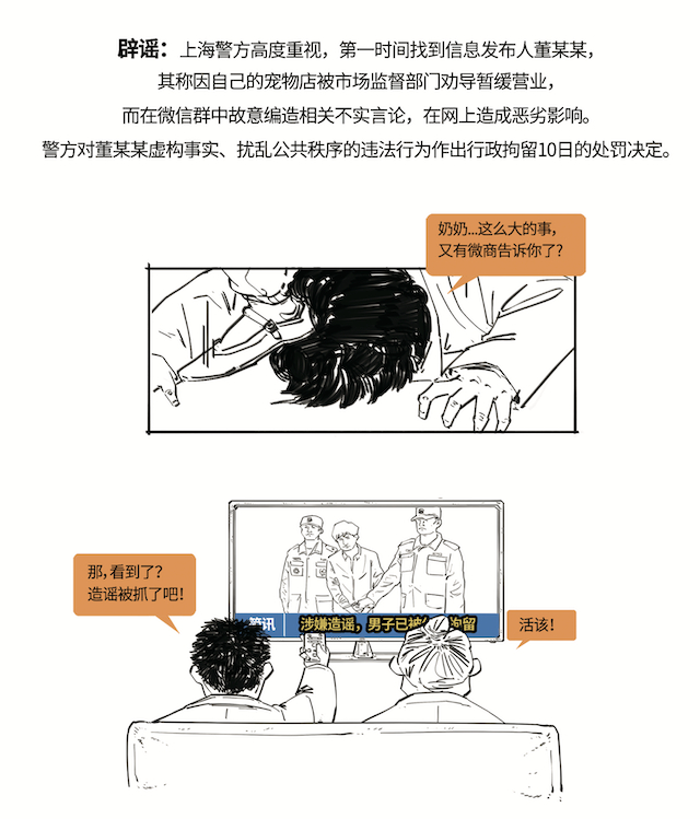 辟谣:上海警方高度重视,第一时间找到信息发布人董某某,其称因自己的宠物店被市场监督部门劝导暂缓营业,而在微信群中故意编造相关不实言论,在网上造成恶劣影响。警方对董某某虚构事实、扰乱公共秩序的违法行为作出行政拘留10日的处罚决定。