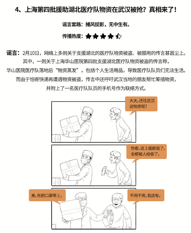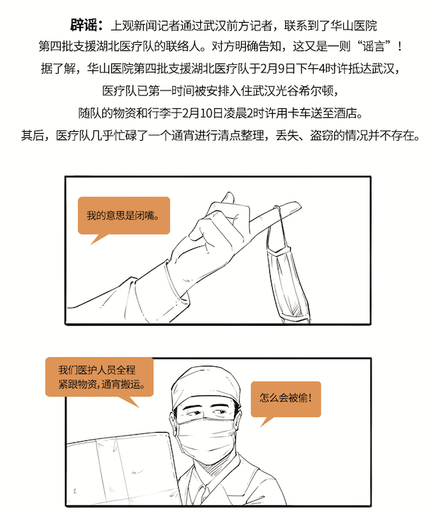 传闻:2月10日,网络上多则关于支援湖北的医疗队物资被盗、被挪用的传言甚嚣尘上。其中,一则关于上海华山医院第四批支援湖北医疗队物资被盗的传言称,华山医院医疗队落地后“物资蒸发”,其中包括队员们的个人生活用品,导致医疗队队员们无法生活。而由于怕寄快递再遭遇物资被盗,传言中还呼吁武汉当地的朋友帮忙筹措物资,并附上了一名医疗队队员的手机号作为联络方式。