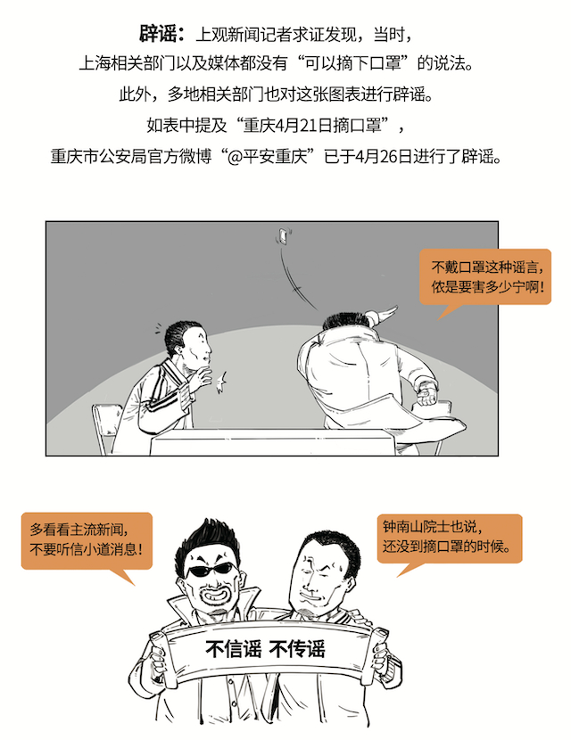 辟谣:上观新闻记者求证发现,当时,上海相关部门以及媒体都没有“可以摘下口罩”的说法。此外,多地相关部门也对这张图表进行辟谣。如表中提及“重庆4月21日摘口罩”,重庆市公安局官方微博“@平安重庆”已于4月26日进行了辟谣。另据央视新闻4月12日报道,中国工程院院士钟南山在接受采访时明确指出,现在还不是摘口罩的时候。