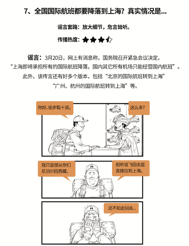 传闻:3月20日,网上有消息称,国务院召开紧急会议决定,“上海即将承担所有的国际航班降落”,国内其它所有机场只能经营国内航班”。此外,该传言还有好多个版本,包括“北京的国际航班转到上海”“广州、杭州的国际航班转到上海”等。