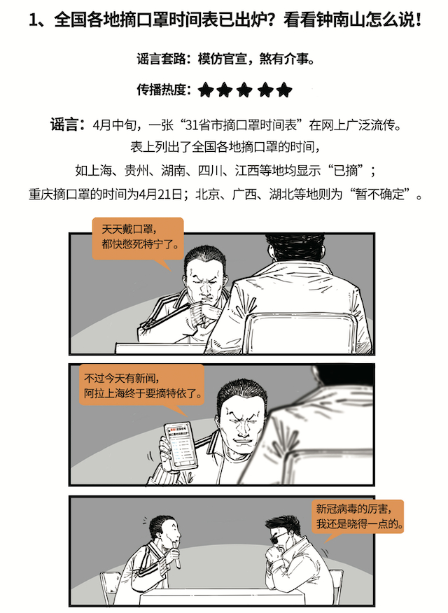 传闻:4月中旬,一张“31省市摘口罩时间表”在网上广泛流传。表上列出了全国各地摘口罩的时间,如上海、贵州、湖南、四川、江西等地均显示“已摘”;重庆摘口罩的时间为4月21日;北京、广西、湖北等地则为“暂不确定”。