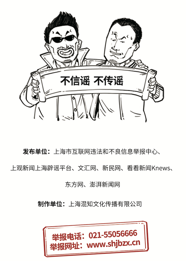 小结:谣言止于智者!上海市互联网违法和不良信息举报中心联合上海主流新闻网站辟谣平台在此呼吁广大网民不造谣、不传谣、不信谣,共建和谐清朗的网络空间。