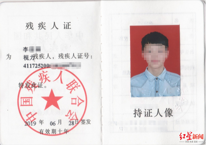 李某洲的残疾证显示,李某洲为视力残疾人,残疾登记为二级,签发日期为2019年6月28日。据了解,我国视力残疾分四级,按视力和视野状态分级,其中盲为视力残疾一级和二级,低视力为视力残疾三级和四级。