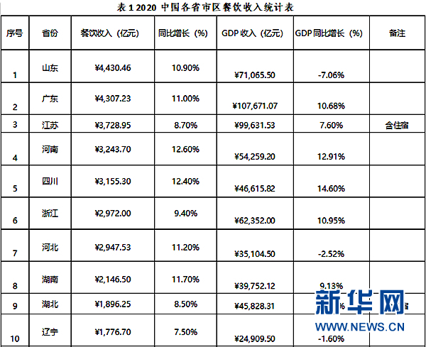在2020中国各省市区餐饮收入排行(2019财年)中,山东省以4430.46亿元蝉联第一名,同比增长10.90%,广东、 江苏(含住宿)、河南、四川、浙江、河北分列第二至七位,餐饮收入分别为4307.23亿元、3728.95亿元、3243.70亿元、3155.30亿元、2972亿元、2947.53亿元,分别同比增长11.00%、 8.70% 、12.60%、 12.40% 、9.40% 、11.20%。