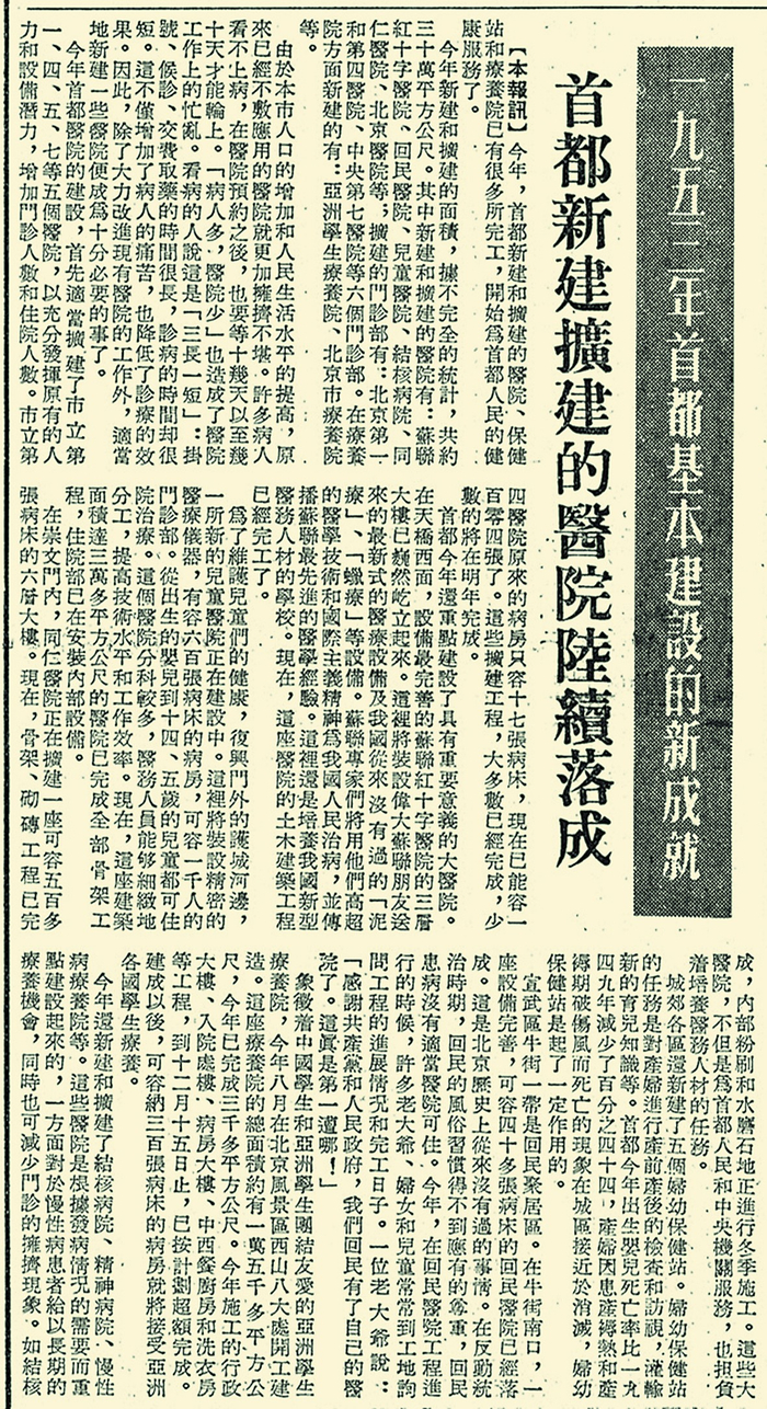 本报1953年12月19日1版《首都新建扩建的医院陆续落成》记录了当年的建设力度:据不完全统计,新建和扩建的医院、保健站和疗养院面积共约30万平方米。其中新建和扩建的医院有苏联红十字医院、回民医院、儿童医院、同仁医院、北京医院等;扩建的门诊部有北京第一医院、北京第四医院、中央第七医院等6个门诊部;新建的疗养院包括北京市疗养院等。