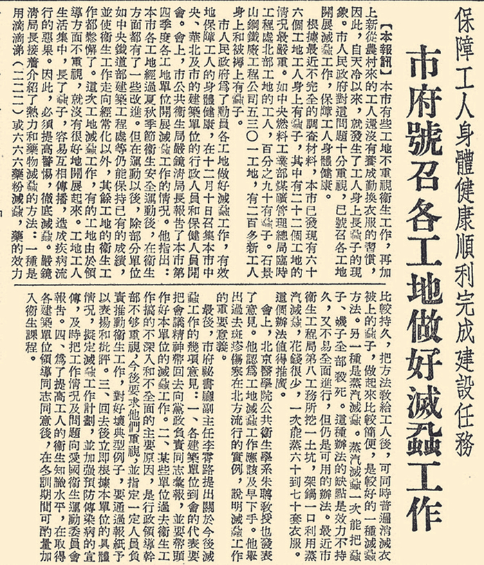 1953年12月19日,《北京日报》2版,《市府号召各工地做好灭虱工作》