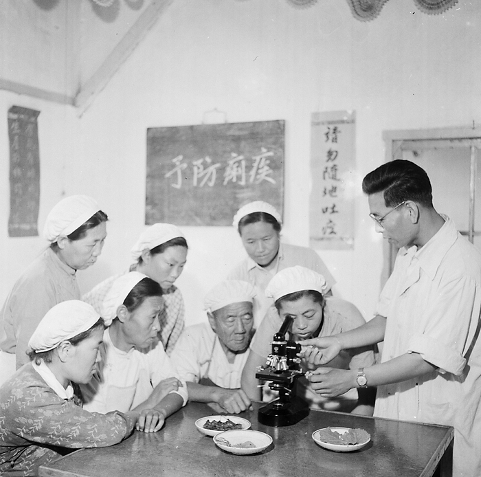 1960年,永定门外人民公社医院的医务人员到郭公庄居民食堂给炊事员讲卫生课,帮助他们掌握防病知识。 冯文冈/摄