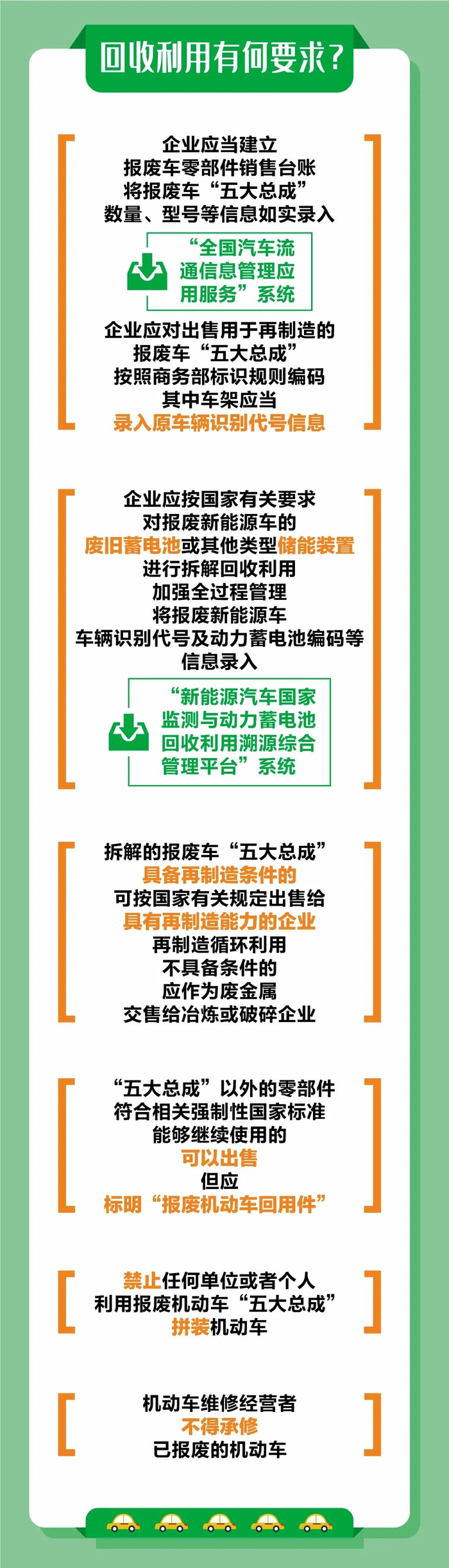 “五大总成”是指机动车的发动机、变速箱等总体架构。与以往的回收“论斤卖”相比,细则确认允许将具有循环利用价值的报废机动车“五大总成”出售给具有再制造能力的企业,经再制造后予以再利用,因此报废车回收价格有望提升。