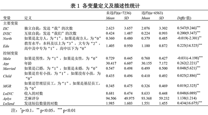 按前述和历史文献佐证,我们将那些借款者已发送短信中,使用“我”的次数越多,视为独立自我倾向越强;而使用“我们”的次数越多,视为互依自我倾向越强。