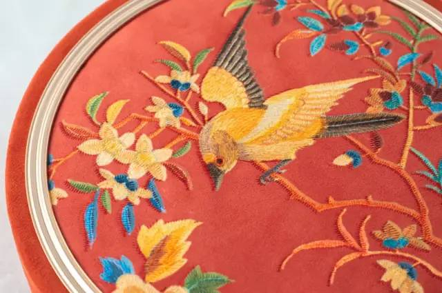 郁玲、扶摇:取自《粤绣花鸟图挂屏》,大红的绒棉上鹦鹉双翅展开,回头观瞧,样子活灵活现。