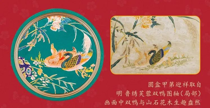 甲第:取自明代的《鲁绣芙蓉双鸭图轴》,画面中双鸭与山石花木生趣盎然。
