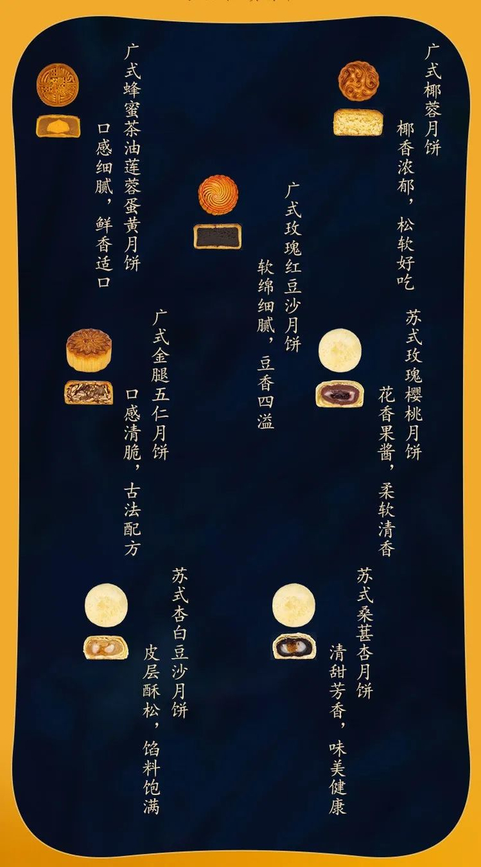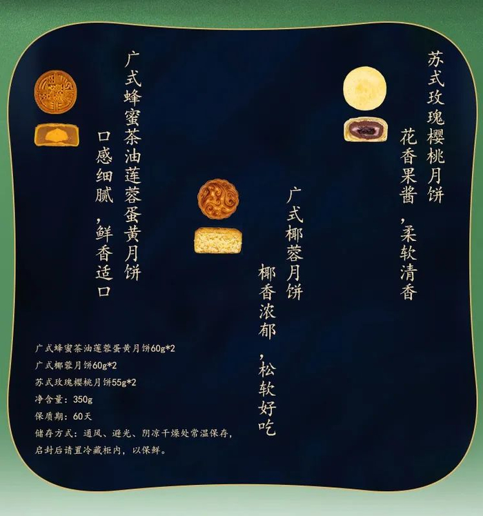 盒中摆放的是广式莲蓉蛋黄、广式椰蓉、苏式玫瑰樱桃3种月饼,共6只: