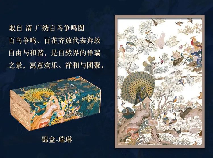 瑞林:取自清代《广绣百鸟争鸣图》,百鸟争鸣、百花齐开一派自由祥和的景象,是自然界的祥瑞之景,寓意家庭和睦、欢乐团圆。