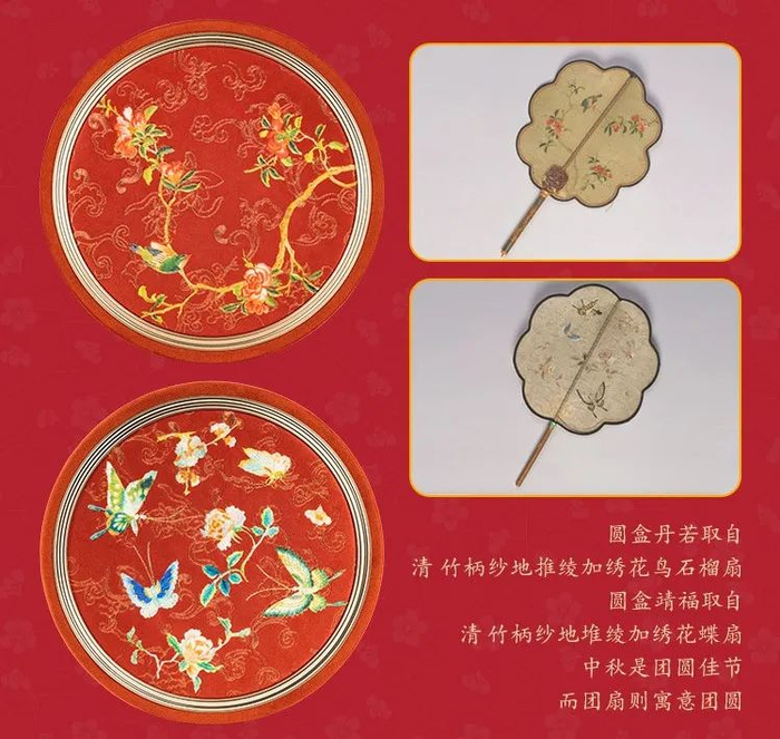 丹若、靖福:取自《竹柄纱地推绫加绣花鸟石榴扇》,中秋是团圆佳节,而团扇则寓意团圆。