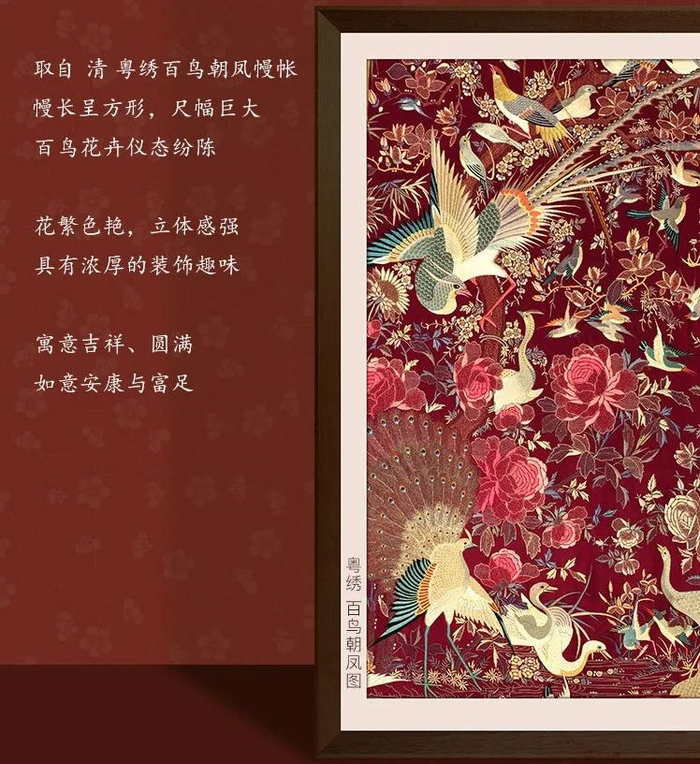 图案取自清朝的《粤绣百鸟朝凤》,百鸟纷闹,花繁色艳,立体感强,具有浓厚的装饰趣味~
