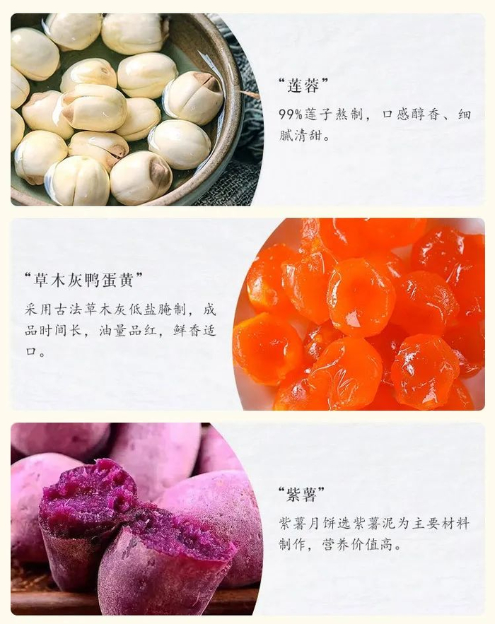 还有,湖南湘潭的莲蓉、江西的紫薯等等,都是选用品相极佳的食物为原料~