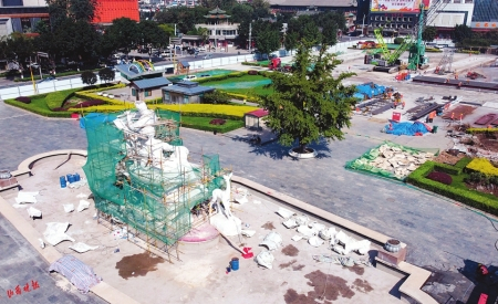 9月2日,在太原市五一广场北广场,工人们正在对“晋泉之声”雕塑做搬迁前的准备。据了解,在太原市现行道路限高的情况下雕塑无法整块搬移,需进行切割,切割前将进行数据取模,以便将来根据模具进行修复。“晋泉之声”预计9月中旬完成切割、吊运和搬移,在晋阳湖公园亮相。