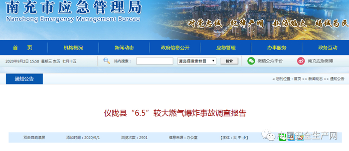 9月1日,四川省南充市应急管理局官网发布仪陇县“6·5”较大燃气爆炸事故调查报告。