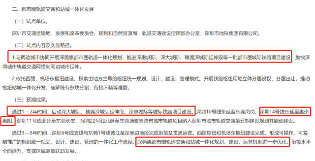《意见》文件中6次提到“都市圈”。其中提出,与周边城市协同开展深莞惠都市圈轨道一体化规划,推进深惠城际、深大城际、穗莞深城际延伸段等一批都市圈城际铁路项目建设,并明确提到“深圳14号线东延至惠州惠阳”。
