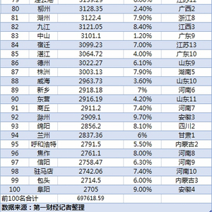 从入围门槛来看,第100名的城市是安徽北部的阜阳,GDP达到2705亿元。在阜阳之后,还有5个城市的GDP超过2600亿元大关,接近100名,分别是汕头、龙岩、泰安、曲靖和宜宾。这其中,作为最早成立的四大经济特区之一的汕头,以2694亿元位居第101名,与百强城市擦肩而过。