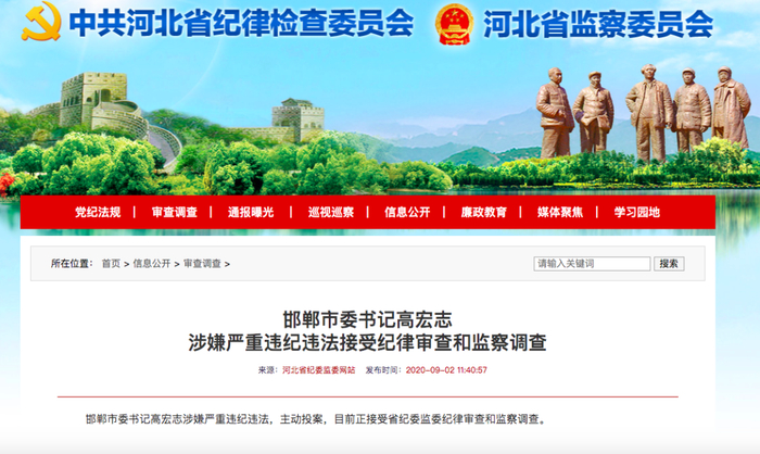 2日,据河北省纪委监委消息:邯郸市委书记高宏志涉嫌严重违纪违法,主动投案,目前正接受河北省纪委监委纪律审查和监察调查。
