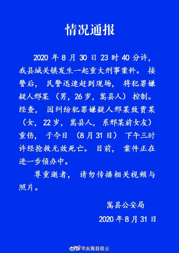 据河南嵩县警方通报:8月30日23时40分许,嵩县城关镇发生一起重大刑事案件。接警后民警迅速赶到现场,将犯罪嫌疑人邢某(男,26岁,嵩县人)控制。经查,邢某因纠纷致贾某(女,22岁,嵩县人,系邢某前女友)重伤,贾某于8月31日下午经抢救无效死亡。目前案件正在进一步侦办中。