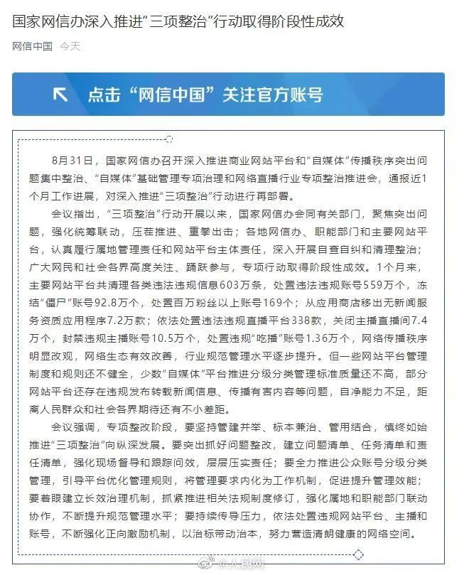 据网信办,1个月来,主要网站平台共处置违法违规账号559万个,冻结“僵尸”账号92.8万个,处置百万粉丝以上账号169个;封禁违规主播账号10.5万个,处置违规“吃播”账号1.36万个。
