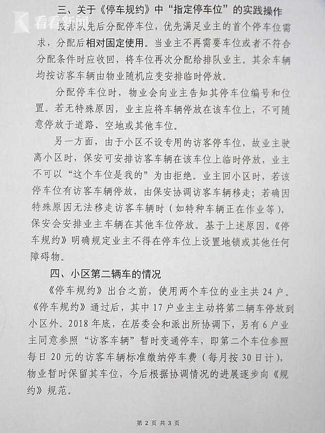 二审审理中,洪先生所在小区业委会出具《小区停车状况说明》,指出小区并没有地下停车位,也没有固定车位,小区地面停车位已经全部分配,另有14户业主申请首个停车位待分配。《停车规约》中明确,车位分配优先满足业主的首个停车位需求。